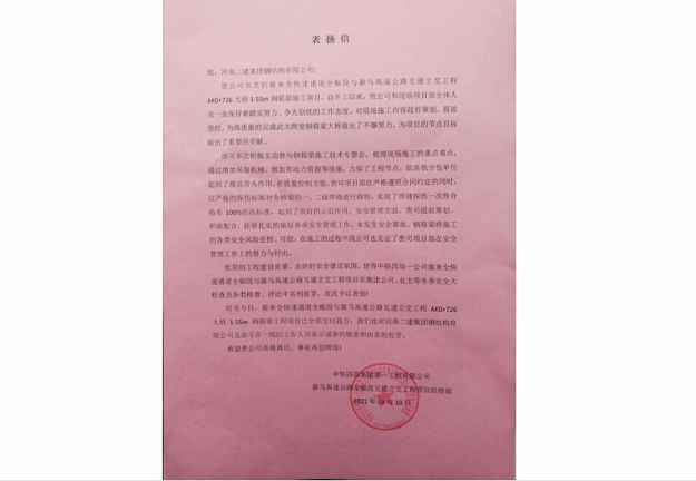 中铁四局集团第一工程有限公司向心博官方网页版-心博(中国)发来表扬信